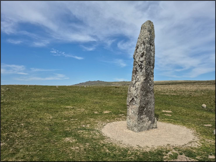 Merrivale’s solitary standing stone, known locally as a ‘Menhir’, with some of the stone ‘avenue’ visible in the middle distance. Photo by Mike Edwardson.