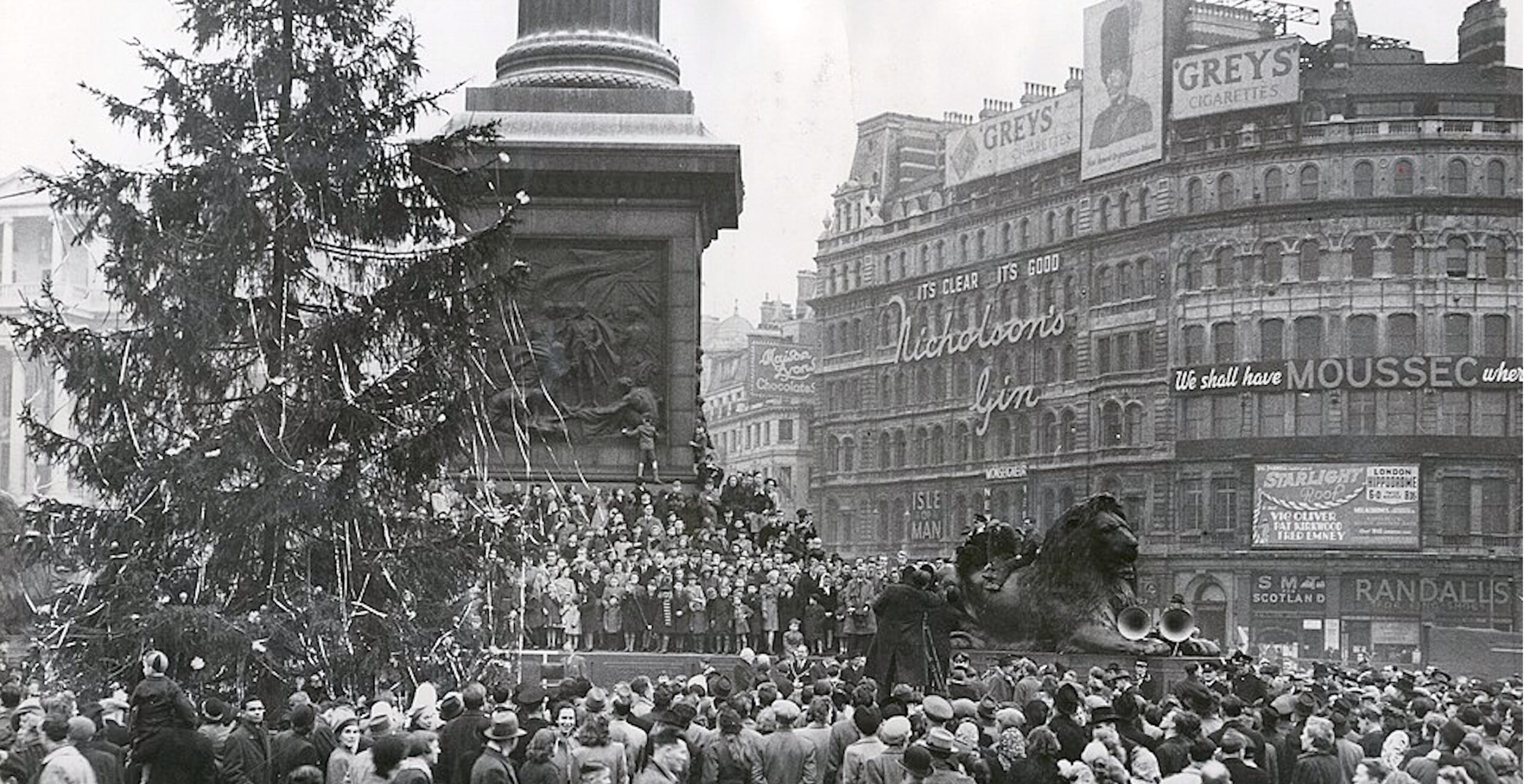 These he had… smuggled over with him at some discomfort, intending to present one to the King… I think it was Ian who suggested it would be a nice gesture to put one up in Trafalgar Square. This we did tying it to a balustrade on the North Side. Of course, there were no fairy lights, but one or two aircraft flares provided illumination.